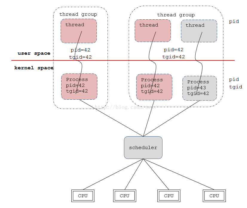 提到NPTL与LinuxThreads的区别,很多人会说到1:1和M:N,即用户态线程与内核态进程的比例问题,用户态看到的那个线程与内核态的进程本来就是同一个进程。如下图: